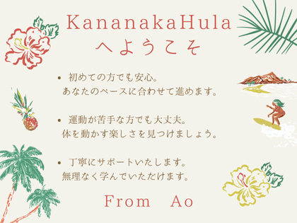 フラは年齢や経験を問わず、どなたでも楽しめる踊りです。 個人レッスンでは「自分のペースで」「誰にも気兼ねなく」学んでいただけます。 一緒にハワイの音楽に身をゆだねて、心と体をほぐしながら新しい一歩を踏み出しましょう。 レッスンに関するご相談も承っておりますので、どうぞお気軽にお声がけください。