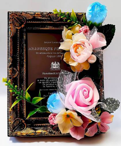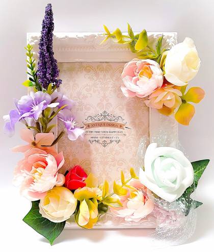 アーティフィシャルフラワーを使い、お洒落なフォトフレームを作ります。